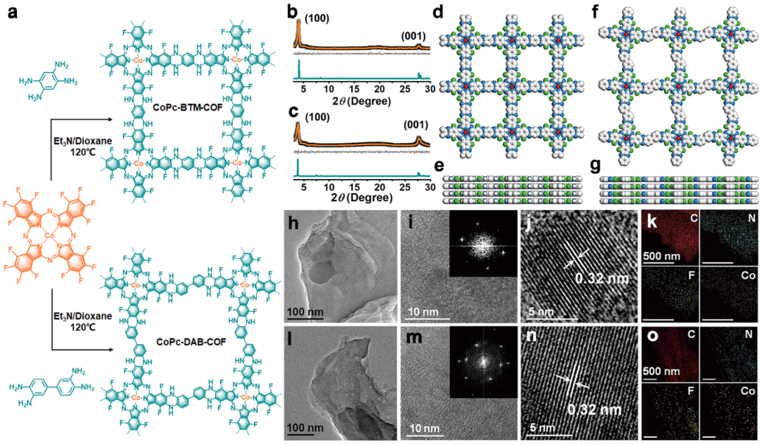 图1. (a) CoPc-BTM-COF 和 CoPc-DAB-COF 的合成示意图。(b) CoPc-BTM-COF 和 (c) CoPc-DAB-COF 的 PXRD图谱。(d, e) CoPc-DAB-COF 和 (f, g) CoPc-DAB-COF 的模拟 AA 堆叠(C:浅灰色;N:蓝色;F:绿色;Co:红色;H:为清楚起见省略)。CoPc-BTM-COF的 (h) TEM、(i, j) HRTEM 和 (k) EDX 元素mapping图像。CoPc-DAB-COF 的 (l) TEM、(m, n) HRTEM 和 (o) EDX 元素mapping图像。