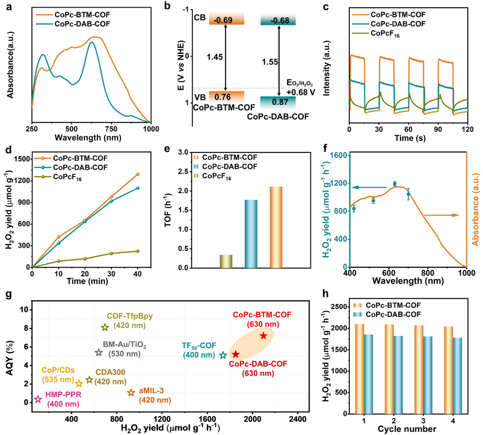 图3. (a) CoPc-BTM-COF 和 CoPc-DAB-COF 的 UV-vis-DRS 吸收光谱。(b) CoPc-BTM-COF 和 CoPc-DAB-COF 的带隙。(c) CoPc-BTM-COF、CoPc-DAB-COF 和 CoPcF16 在 λ > 400 nm 照射下的瞬态光电流。(d) CoPc-BTM-COF、CoPc-DAB-COF 和 CoPcF16 的光催化 H2O2 产率。(e) CoPcF16、CoPc-BTM-COF 和 CoPc-DAB-COF 的 TOF。(f) 在 CoPc-BTM-COF上,与波长相关的 H2O2 产率。(g) CoPc-BTM-COF 和 CoPc-DAB-COF 与已报道的光催化剂在可见光区域的光催化 H2O2 产率和 AQY 的比较。(h) CoPc-BTM-COF 和 CoPc-DAB-COF 对 H2O2 合成的稳定性测试 (λ > 400 nm)。