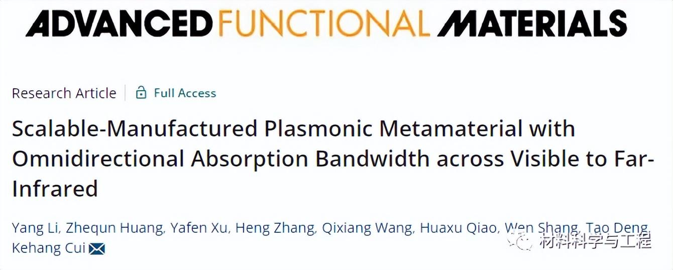 上交《AFM》:一种等离子体超材料,可见光到远红外全向吸收带宽
