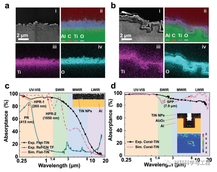 图 2.结构和光学表征。a)扁平TiN样品和b)珊瑚- TiN样品的横截面扫描电镜图像和元素映射。c) 使用积分球测量的 ref-TiN TF 样品和扁平 TiN 样品在可见光、近红外、SWIR、MWIR 和长波红外范围内的总半球吸收光谱。虚线表示基于插图所示的扁平TiN模型的FDTD模拟吸收光谱。d) 使用积分球测量的珊瑚-TiN 样品在可见光、近红外、SWIR、MWIR 和长波红外范围内的总半球吸收光谱。
