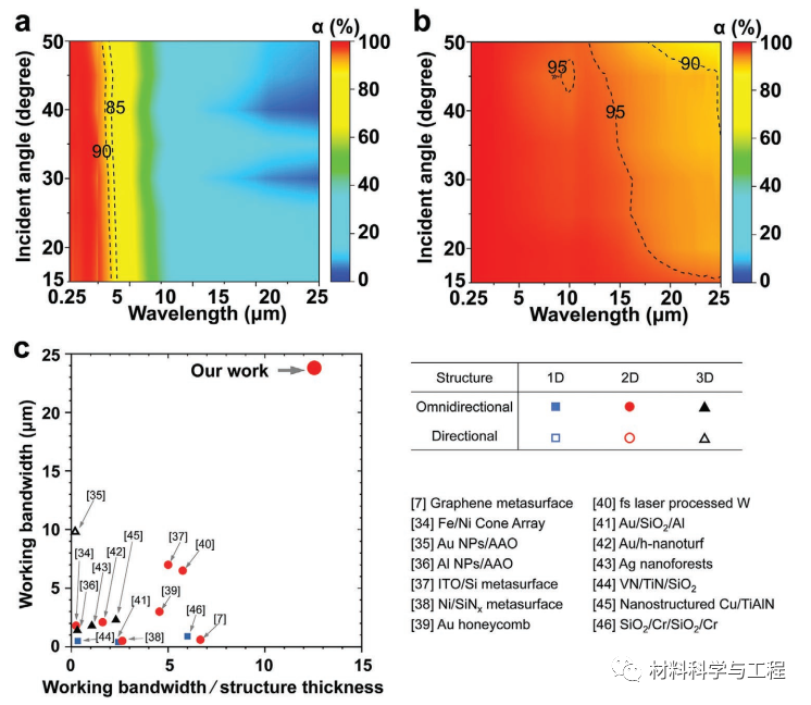 图 3.全向吸收表征和基准测试。使用紫外-可见-近红外光谱和傅里叶变换红外光谱测量的a)平坦TiN样品和b)可见光,近红外,SWIR,MWIR和长波红外光谱范围内的珊瑚 - TiN样品的实验角度分辨吸收光谱。c) 基于工作带宽和工作带宽指标的宽带吸收器性能。