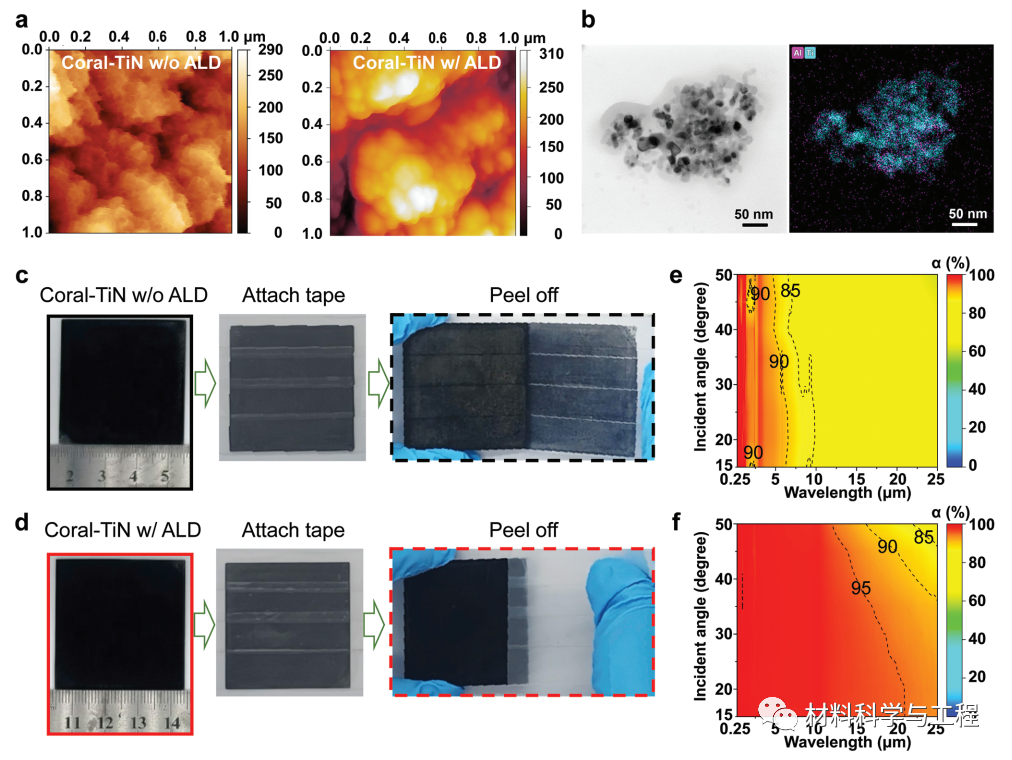 图4.涂有氧化铝保护层的珊瑚-TiN BBA。A)有和没有ALD-Al2O3保护层的珊瑚-TiN BBA的原子力显微镜高度图。B) ALD-Al2O3保护层TiN纳米粒子的电子显微镜图像和EDS-TEM元素图谱。C)无ALD-Al2O3涂层的珊瑚锡BBA的流延试验结果。D)涂有ALD-Al2O3涂层的珊瑚锡BBA的带式试验结果。E)无ALD-Al2O3保护层的珊瑚-TiN BBA的全光谱半球形吸光度。F)涂有ALD-Al2O3保护层的珊瑚锡BBA在胶带试验后的全光谱半球吸光度。