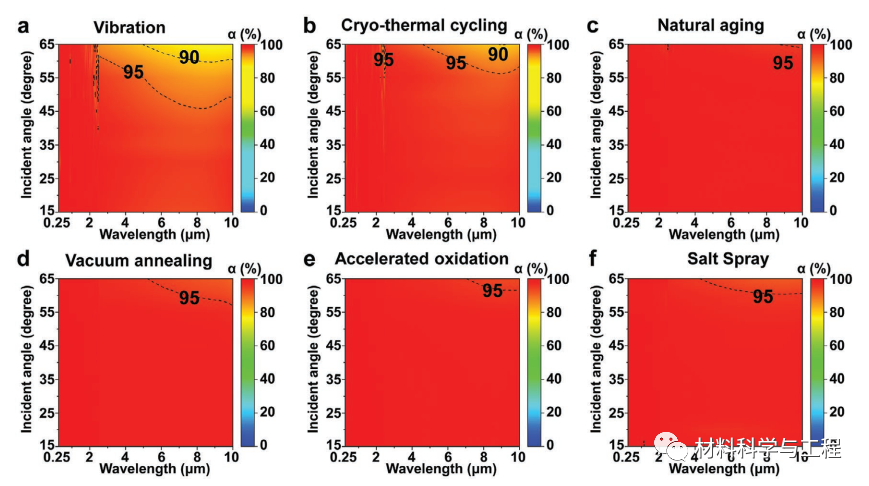 图 5.在恶劣环境中进行航空航天级可靠性测试。ALD Al2O3保护涂层的珊瑚-TiN BBA的全谱半球吸光度 a) 振动试验,b) 低温热循环老化试验,c) 500 ℃下长期高温真空退火试验20 h, d) 200 ℃ 加速抗氧化试验 20 h, e) 潮湿环境中的自然老化, 和f)盐雾腐蚀试验。