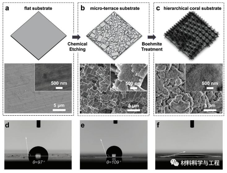 图 1.不同处理工艺下基材的表面形貌和润湿行为。a)平面基质,b)微梯基质和c)分层珊瑚基质的示意图和SEM图像。d)平面基质,e)微梯基质和f)接触角测试中的分层珊瑚基质上的水滴。