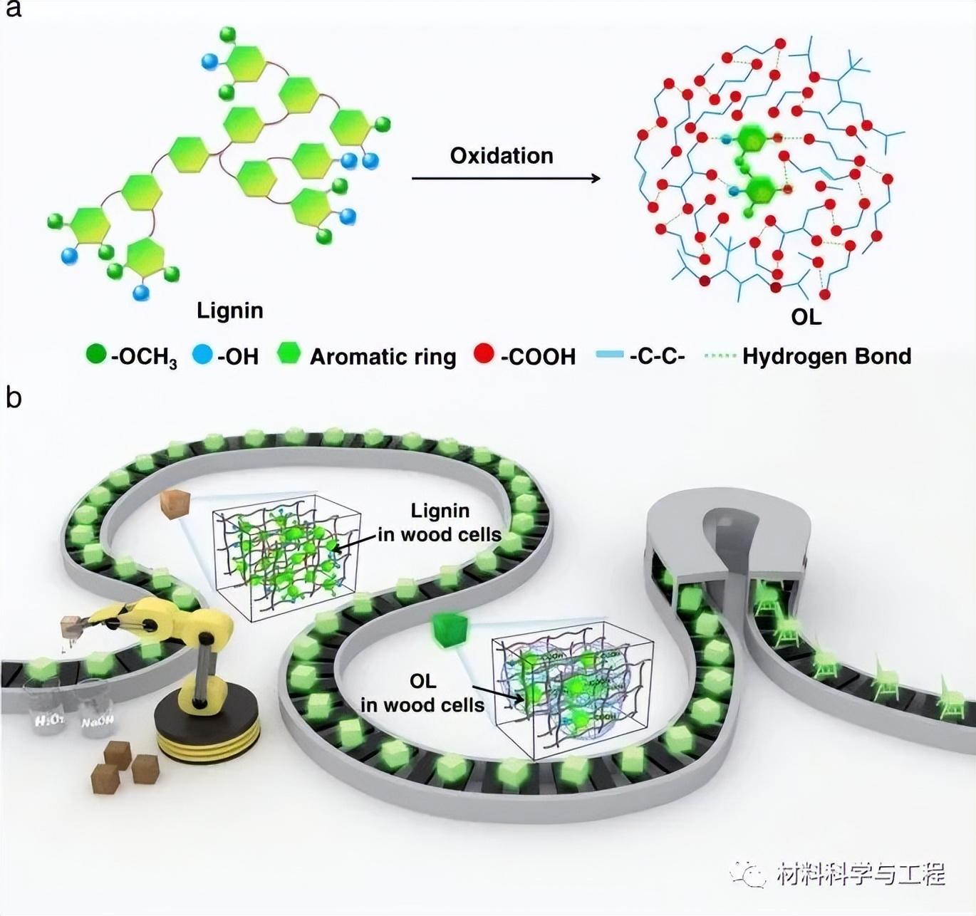 可持续余辉室温磷光(RTP)材料,特别是余辉室温磷光结构材料至关重要,但仍难以实现。在此,来自南京工业大学&中国科学院化学物理研究所&东北林业大学等单位的研究者,开发了一种氧化策略将木质素转化为寿命约408 ms的余辉材料。具体来说,木质素在H2O2作用下被氧化生成芳香发色团和脂肪酸。相关论文以题为“Structural materials with afterglow room temperature phosphorescence activated by lignin oxidation”发表在Nature Communications上。