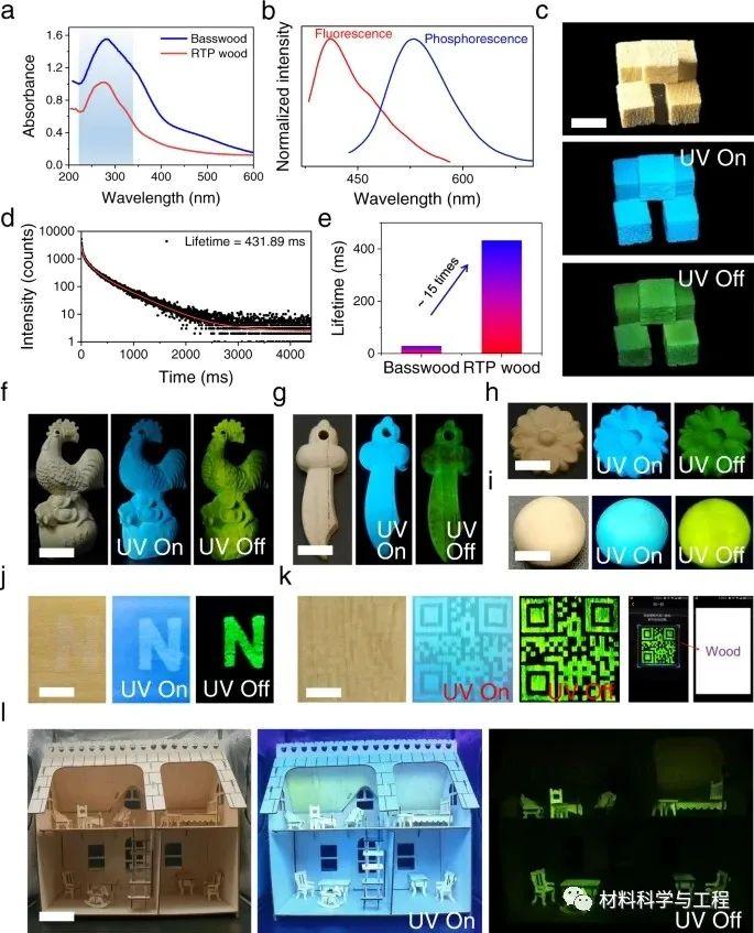 在此,研究者开发了一种氧化方法,将木质素转化为可持续的余辉RTP材料,而不添加额外的合成基质。具体来说,木质素的G单位和S单位被氧化生成G酸和S酸(发色团),然后通过氢键被脂肪酸(作为基质,也由于木质素氧化)锁定(图1a)。结果,OL显示有效的余辉发射。更有趣的是,在这一发现的推动下,建造了一条自动生产线,通过在木材细胞壁中自然产生的木质素原位氧化,将天然结构材料木材转化为RTP木材(图1b)。制备好的RTP木材显示出建造余辉可持续家具的巨大潜力。