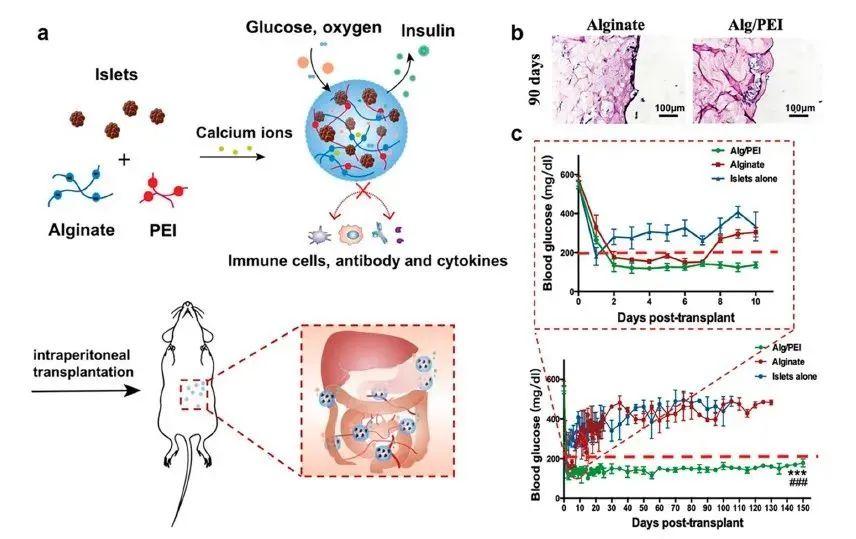 FBR是指当医疗仪器设备植入到动物体内后,其周围会形成厚且致密的一层胶原纤维囊,阻断设备与周围组织的物质与信号传递,致使植入失败。为此,FBR是当前植入设备面临的一个重要挑战。基于两性离子材料的抗生物粘附特性,近年来,江绍毅教授和张雷教授开发了一系列抗FBR的可植入材料。首次证明了两性离子水凝胶植入动物体后,可长期避免胶原纤维囊的形成,完全克服了动物体内的FBR。基于该工作,又开发了电荷平衡混电型“免疫屏蔽”水凝胶,可包封保护胰岛不受FBR和免疫系统攻击的影响,如同为其穿上一层“隐身衣”。该“人造胰岛”植入小鼠腹腔后,使小鼠血糖在2天内快速降低到正常水平,且稳定维持至少150天(如图2)。