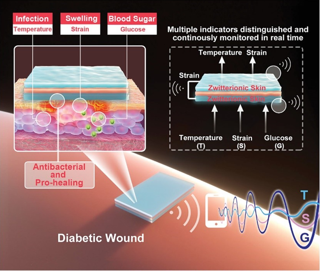 仿皮肤传感器可模拟人类皮肤,感知多种外部刺激,现已应用于疾病诊疗、人工智能等前沿领域。但由于多重响应信号会彼此干扰,在单一仿皮肤传感器中实现多重信号的检测并实时解耦仍然是一个挑战。张雷教授团队利用两性离子材料的抗生物粘附特性,增强了仿皮肤传感器的灵敏性,开发出了新型智能传感敷料,实现了多重信号的实时监测与区分,并有效促进了慢性伤口(如压疮、糖尿病伤口)的愈合(如图3)。