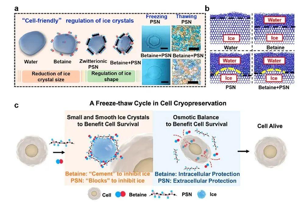 细胞可在超低温条件下(-80~-196℃)停止新陈代谢,处于“假死”状态,从而实现长期保存。而冻存保护剂能够在降温过程中保护细胞免受冰晶损伤,但现有保护剂存在易致溶血、有毒性等问题。为解决这一问题,张雷教授团队开发出可模拟天然抗冻蛋白的两性离子共聚物,能够结合到冰晶面上有效抑制冰晶生长;同时,基于Gibbs−Curie−Wulff原理,协同使用两性离子小分子使冰晶变得平滑,从而显著提升对细胞的保护性(如图4)。团队开发了一系列高生物相容性细胞冻存剂,应用于红细胞、干细胞、T细胞等重要治疗性细胞的冻存,取得了突出的冻存效果。