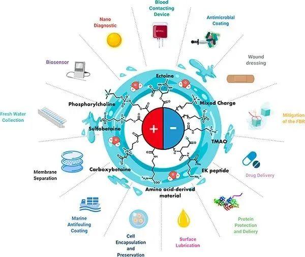 “两性离子聚合物 (zwitterionic polymers)”是一类在重复单元上具有一对相反电荷的聚合物材料,可通过离子溶剂化作用发生水合效应,且强于传统非离子型亲水材料通过氢键作用产生的水合效应。两性离子聚合物具备两个主要特点:(1)电荷平衡——正负电荷基团的量相等;(2)最小化偶极——正负电荷在分子水平均匀分布。由于这些特性,两性离子聚合物不会因局部产生电荷而静电吸附蛋白质。这种强水合效应、电荷平衡、最小化偶极决定了两性离子材料的优异抗生物黏附性,包括抗非特异性蛋白质吸附、抗细胞黏附、抗血栓形成、抗免疫排斥反应(Foreign body reaction,FBR)、抗细菌黏附及生物膜形成、抗海洋生物污损等。因此,两性离子材料在血液接触设备、植入设备、医疗设备润滑、抗菌涂层、伤口敷料、纳米医用材料、海洋涂料、抗污分离膜、仿皮肤传感器等生物医学应用以及工业应用中获得广泛关注。另外,除了具备突出的抗生物粘附性,由于强水合效应,两性离子材料能够有效降低冰点,抑制冰成核与生长、修饰冰晶形貌,表现出突出的抗冻性能。