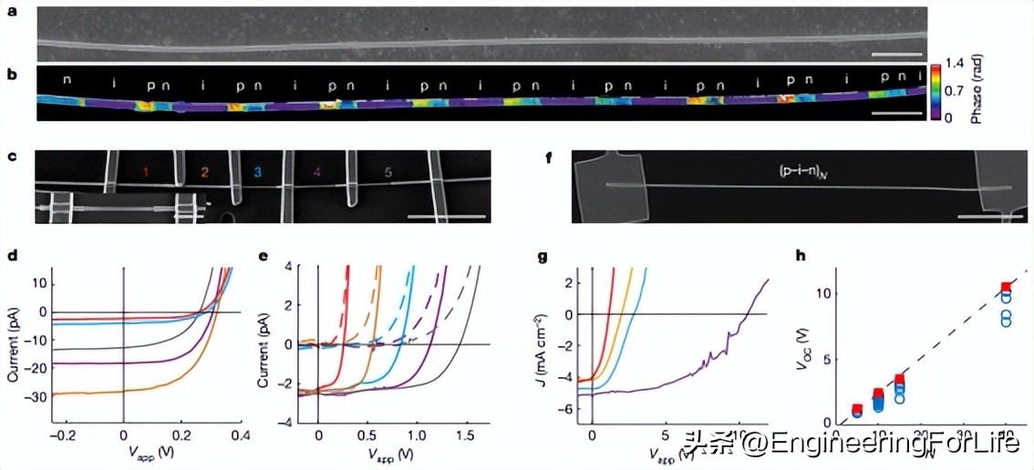 要想实现上述研究目标,首先就是选取合适的催化剂材料。一直以来,硅由于可以吸收可见光和红外光,且具备丰富性、低毒性和稳定性等其他优异的特性,因而被认为是太阳能电池(也称为光伏电池)和半导体的首选材料。然而,由于其电学性质,要想用硅纳米粒子无线驱动水分解的方法只能是在每个纳米粒子中编码多个光伏电池单元,而这一目标则可以通过在两种不同形式的硅半导体材料(p型和n型)之间来生成包含有多个界面(称为结,MJ)的粒子来实现。因此,研究在能够实现p型和n型Si20的突变掺杂转变的自制化学气相沉积反应器中,通过Au催化的气-液-固(VLS)工艺生长了直径为150–200nm的硅纳米线(SiNWs)。