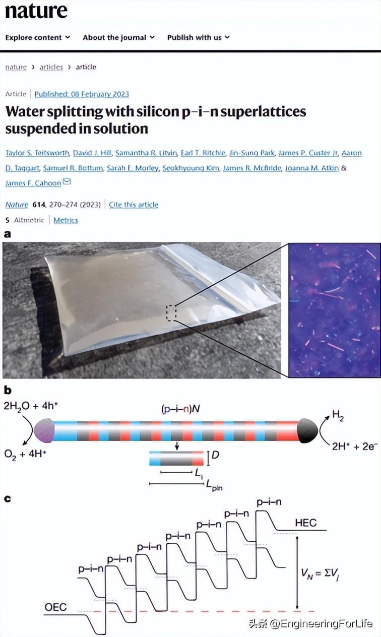 为了解决这些问题,来自北卡罗来纳大学Chapel Hill分校化学系的James F. Cahoon教授课题组将用于光电转化的硅纳米线材料设计成了能够用于将水分解成氢气和氧气,并且当与助催化剂结合并悬浮在水中时,这些光活性纳米反应器能够在可见光和红外光下分解水产生氢气(650 nm光照射产氢是PSR迄今为止最长波长),同时具备规模经济性。该研究内容以“Water splitting with silicon p–i–n superlattices suspended in solution”为题于2023年02月08日发表于国际顶级期刊《Nature》,并进行《Research Briefing》专栏报道。