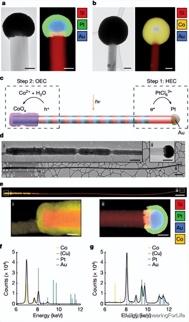 多结线的光伏特性几乎是理想的:产生的电压随着串联编码结的数量线性增加。然而,用于水裂解的SiNWs需要在n型端使用析氢催化剂(HEC)进行质子还原,在p型端使用氧催化剂(OEC)进行水的氧化。此外,对于颗粒悬浮反应器(PSR),共催化剂必须同时沉积在数百万到数十亿个SiNW上。由于线结的固有不对称性,研究开发了一种自下而上的空间选择性光电沉积工艺,能够使用光驱动电化学方法将助催化剂选择性地沉积到线的末端,并分别使用了Pt和氧化钴(CoOx)材料作为HEC和OEC。为了测试SiNW的PEC活性,研究制造了单个SiNW器件,其中HEC或OEC功能化末端分别浸没于pH 7的水中,而另一端则分别电连到Ir/IrOx或Pt反电极。在零外部施加偏压和可变波长(445–650 nm)发光二极管(LED)的照明下 ,在暴露了 Pt和CoOx末端的SiNW中观测到了光阴极电流和光阳极电流,这可能主要是由于氢和氧析出反应。