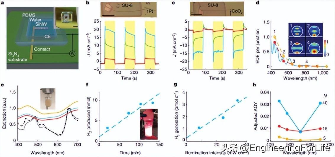 该课题组之前的研究重点是用硼(制造p型纳米线)和磷(制造n型纳米线的)自下而上合成和空间控制调制硅半导体,以赋予其理想的几何结构和功能。在这项研究中,研究者们使用这种方法创建了一类新的水分裂多结纳米颗粒,这些技术结合了硅的材料特性和经济优势以及纳米线的光学优势(纳米线的直径小于吸收光的波长),使得其能够在可见光和红外光波段分解水产氢,同时保障规模经济性。虽然该研究开发的单纳米线反应器具有很高的量子效率,但所得PSR的太阳能制氢效率很低,仍需进一步优化并了解它们在溶液中的整体行为。此外,这项研究中仅仅展示了该光伏粒子或纳米级反应器在水分解中的应用,但未来也可能具有其他光催化电子、机械或信号方面的应用。因为这些纳米线的功能可以通过改变电压(通过改变结的数量)、光学性能(通过调整纳米线的几何形状)或反应性(通过使用不同的共催化剂)来按需改变。