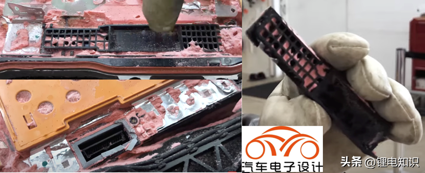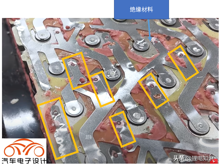 为了方便电流连接,类似大框架模块两端输出的连接通过激光焊接与输出极片连接,输出极通过框架塑料基板顶起来。整个电气部分还是通过橘黄色的塑料板顶起来,然后通信线通过顶部管道连接到BMS。