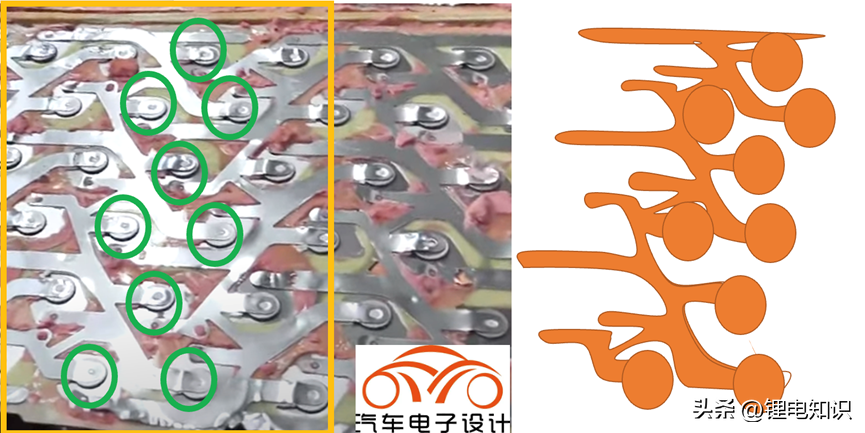 汇流排设计的并联结构,确实有点诡异,从目前清点的数量来看,凸起来有9个电芯,一共有6排,然后按照三角形进行圈住。下面图里面,用黄色框代表一个特写,绿色我圈出来的电芯。然后我把整个的汇流排结构用圈住的方式进行标注,因此这里分为两部分: