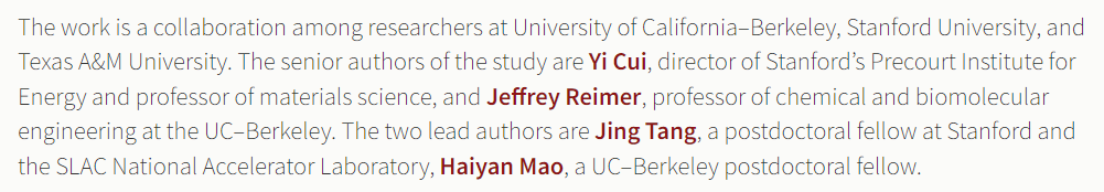 该研究是斯坦福大学与加州大学伯克利团队合作成果。唐静是斯坦福大学学者,致力于开发和发明新型材料科技助力全球碳中和。该研究是唐静在斯坦福大学从事博后研究时,在导师崔屹教授指导下完成的。