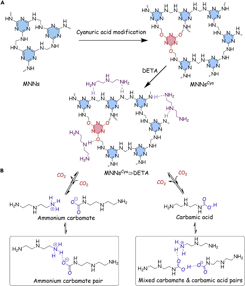 斯坦福大学材料科学系学者、该论文共同第一作者唐静表示,“在这个改性网络中,氰尿酸在聚合过程中作为 MNNs 掺杂剂被引入,并用作烷基胺的非共价锚定位点,以最终保持 CO2 吸附能力并提高化学稳定性。通过添加 DETA 从而提高了 CO2 的化学吸附能力。”