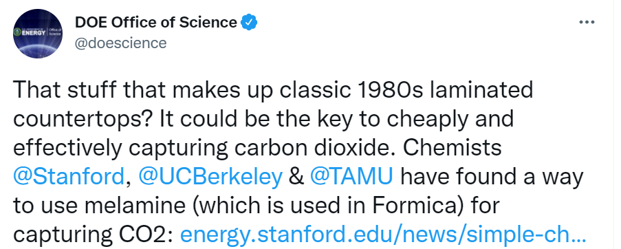 3. That stuff that makes up classic 1980s laminated countertops? It could be the key to cheaply and effectively capturing carbon dioxide. https://twitter.com/doescience/status/1562803740096151552