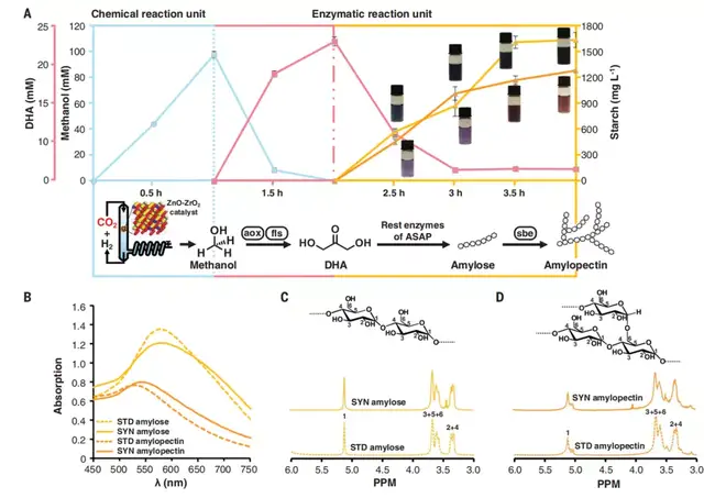 该团队基于 “搭建积木” 的类似方法,使用无机催化剂将高密度氢能作用下的二氧化碳还原成碳一(C1)化合物甲醇,再根据化学聚糖反应原理,利用碳一聚合新酶将碳一化合物聚合成碳三(C3)化合物,随后采取生物途径优化,把碳三化合物聚合成碳六(C6)化合物,最后成功合成出直链和支链淀粉(Cn)化合物。