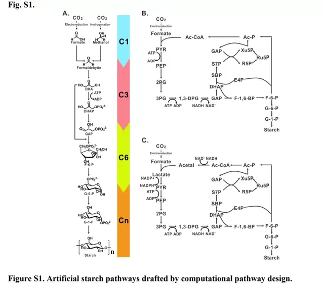 这种人工淀粉合成途径依赖于许多不同生物来源的工程化重组酶,且可以被调整为直链淀粉或支链淀粉。与其他固定二氧化碳的人工合成系统相比,其速度和效率都非常好。