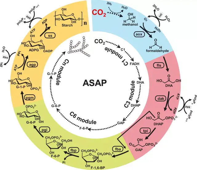 他们首先计算出了反应所需的路径,之后通过组装和替换由来自 31 个生物体的 62 种酶构成的 11 个模块,设计开发出多条人工淀粉合成途径(artificial starch anabolic pathway, ASAP)1.0,其中有 10 个以甲醇为起始的酶促反应,并最终筛选得出符合条件的路径。