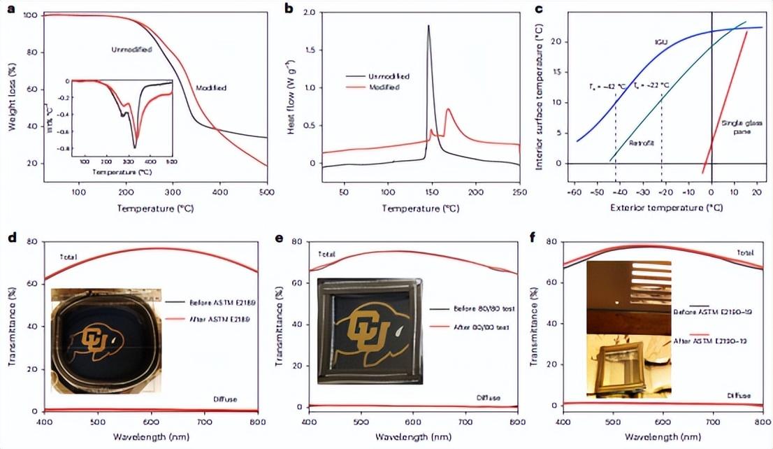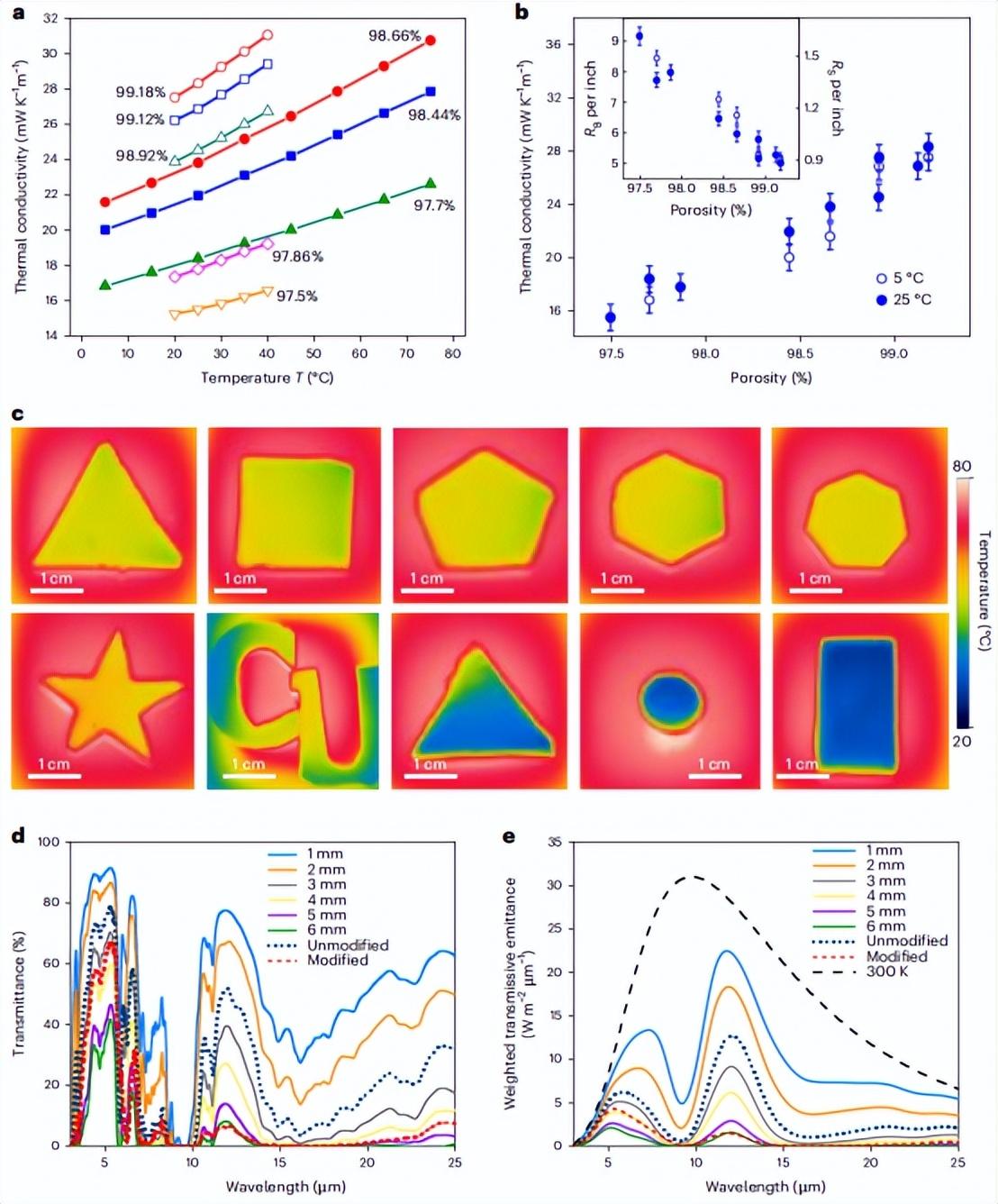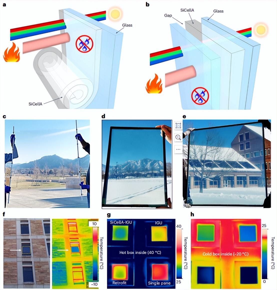 研究者的透明、超级隔热的SiCellA材料被设想用来提高现有窗户的效率,并实现先进的窗户产品(图1a,b),正如他们使用基于SiCellA的改造薄膜和中空玻璃的原型在窗户相关的尺度上所展示的那样(图1c-e和补充图1和2)。由于静电充电,SiCellA薄膜很容易粘附在塑料薄膜和玻璃板的表面。SiCellA薄膜(图1c)在用作单层玻璃窗的改造时,可以提高其内表面的隔热性能,这一点在冬季玻璃外表面温度的热成像中得到了生动的体现(图1f)。经测量,改造后的玻璃外表面的温度低于没有改造的类似玻璃,因为安装了SiCellA改造后,能更有效地阻挡通过窗户的热量传递(图1f)。热箱和冷箱(方法)分别模拟了夏季和冬季的室内外热交换,说明SiCellAs在单层玻璃上夹层或插入双层中空玻璃的缝隙中时,具有类似的优越的热障性能(图1g,h)。