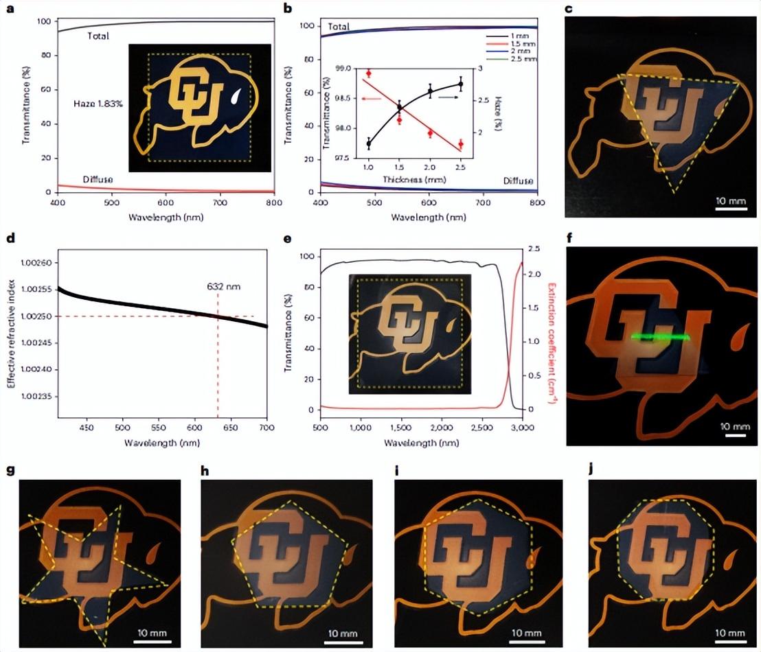 现代窗户和天窗被期望有效地将受控的室内环境与建筑物的外部分开,同时通过透明性来实现其主要功能,这就对各自的材料特性提出了要求。为了探测这些特性,他们表明独立的SiCellA板具有非常高的可见光范围的透射率,在97-99%之间,远远高于单个透明玻璃的92%(图4a-c,补充图1和补充表1)。此外,雾度系数很低,通常在1-3%以内,取决于SiCellA板的厚度(图4a,b)。可以制成高度透明、低散射的不同厚度的板块(图4b和补充视频3和4)。这种光学透明度源于SiCellA的纳米级结构(图3和补充视频2),其中气凝胶形态的所有长度尺度都比可见光谱范围内的光的波长小很多。