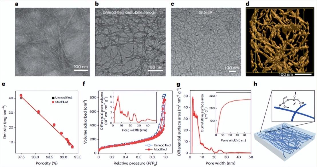 纳米级的表征提供了对SiCellA材料的形成和结构的深入了解(图3)。个体化的纤维素纳米纤维是定义明确的棒状颗粒,宽度为4-6 nm,长度为数百至数千纳米(图3a)。凝胶化、表面改性、溶剂交换和干燥的制造过程将这种纳米棒的初始胶体分散体转化为具有纳米级形态的凝胶,其特点是薄纤维网络,纤维间的孔隙通常小于100 nm(图3b-d和补充视频2)。通过控制纤维素纳米纤维的初始浓度,可以改变SiCellA的孔隙率(图3e),它与材料的质量密度呈线性关系。氮气的吸附-解吸分析与直接的纳米级成像一致,产生了关于SiCellA的多孔形态的定量信息(图3f,g,补充图6和补充视频2),与相互连接的纳米纤维网络相关(图3h)。