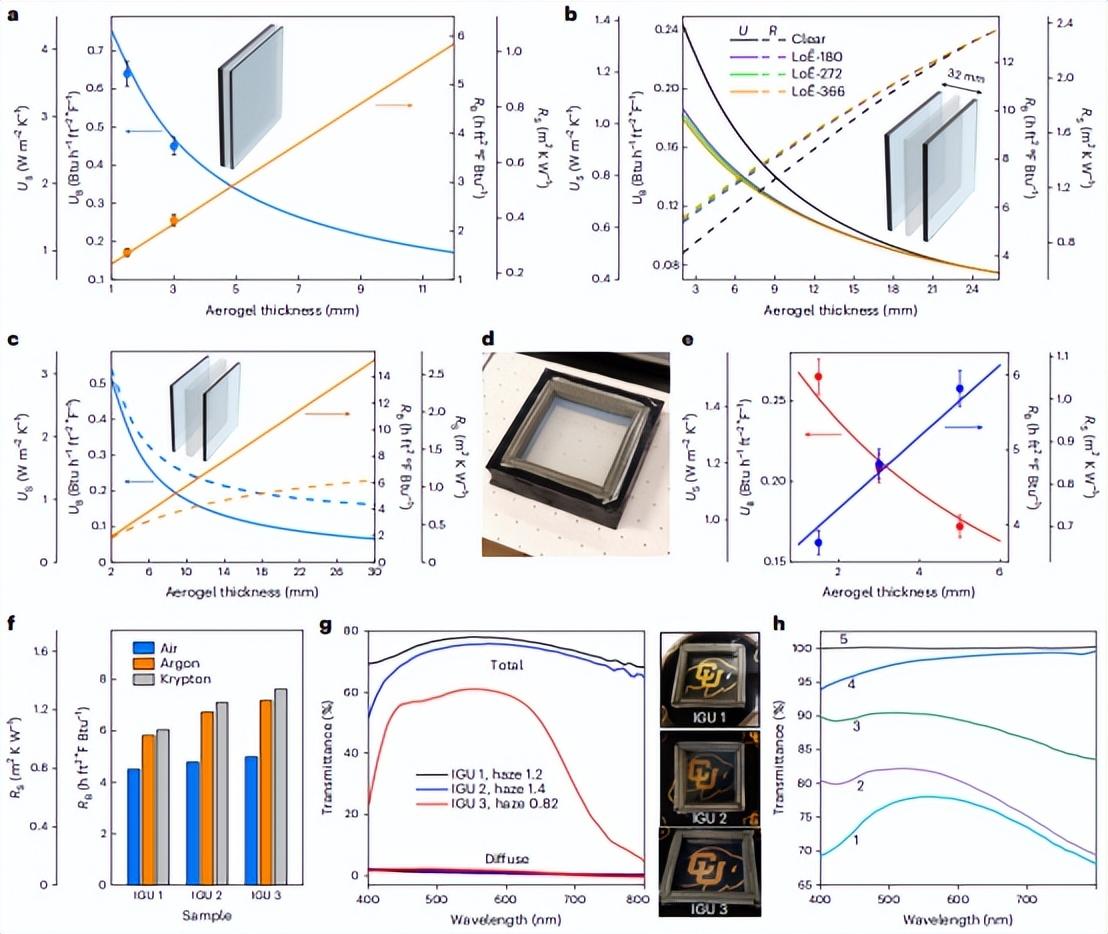 为了提供理想的室内条件,而不考虑室外环境,只需少量或不需要额外的能源供应,建筑围护结构需要通过热传导、对流和排放来尽量减少内部和外部的能量交换。由于对可见范围的透明度和雾度有典型的严格要求,用玻璃来实现这一目标特别具有挑战性。虽然目前应对这一挑战的方法是利用带有空气或填充气体的中空玻璃单元(IGU),但这种中空玻璃单元的高热阻隔性能要求玻璃板之间有较大的间隙厚度,而这又受到气体对流、玻璃板数量和结构的限制。另一方面,使用更薄的真空中空玻璃单元,则受到密封完整性和高成本的限制。低辐射银和其他涂层可以限制来自室温建筑内部的类似黑体的电磁辐射所造成的能量损失,尽管它们只能捕获一小部分逸出的能量,而代价是可见范围的透明度下降。气凝胶是一种高热绝缘材料,用于从管道绝缘到火星探测器的各种应用,作为气体填充物的固体材料替代品,在中空玻璃内部的应用一直备受追捧,因为它们作为一类能够胜过静止空气和其他气体填充物的高效热障的材料而脱颖而出。然而,气凝胶通常在机械上是脆弱的,并有强烈的散射光。在与建筑相关的规模和成本下,制造具有低雾度、高透明度和机械坚固性的气凝胶也仍然是一个挑战。透明气凝胶的开发,包括纤维素基的气凝胶,仍然局限于小规模,同时也具有雾度和透明度的特点,仍然不足以用于大多数类型的玻璃。虽然控制热辐射的技术解决方案已经非常充分并被广泛使用,而且最近出现的电致变色方法有望解决太阳能增益和隐私控制的需要,但缺乏良好的透明隔热层极大地限制了窗户技术的能源效率。