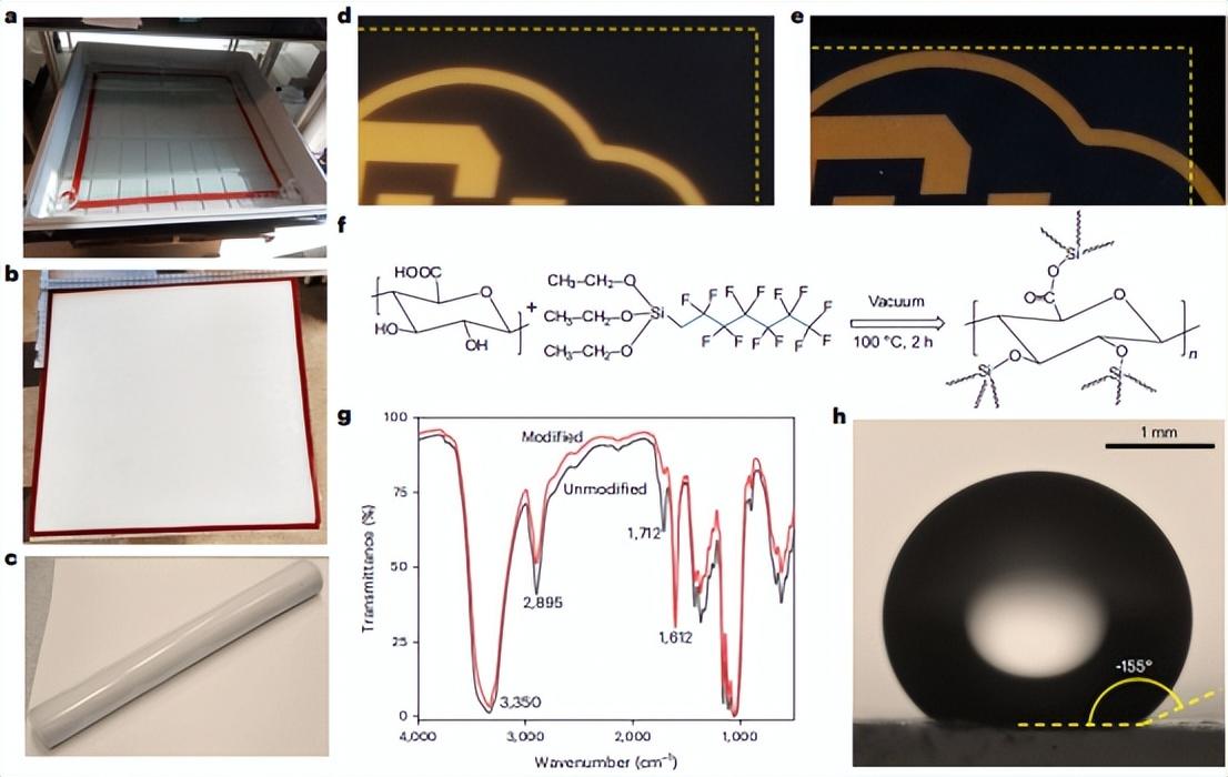制造过程的一个重要部分是纤维素表面被硅烷化,这可以在超临界干燥后通过气相功能化(图2f)或在干燥前的水凝胶阶段完成,两种方法的细节在方法中描述,图2f和补充图4e-k。硅烷化过程使SiCellAs具有超疏水性(补充视频1;注意图2h中显示的水滴接触角>150°),这是窗户应用非常理想的特性,红外光谱学通过分析相应吸收线的存在或强度也显示了这一点(图2g)。