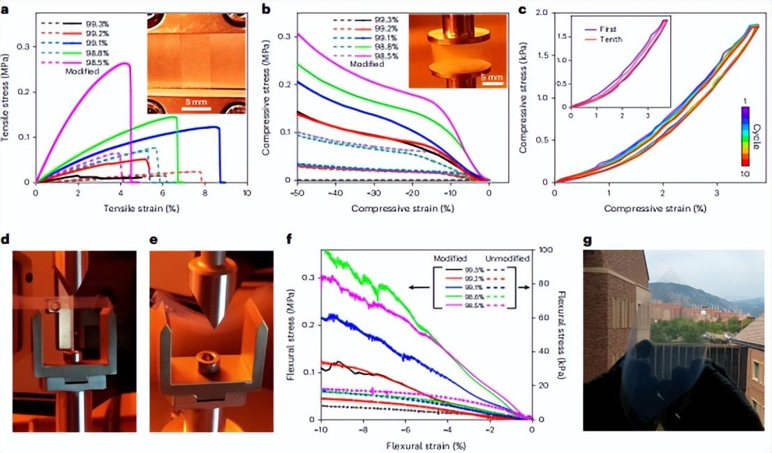 接下来,他们通过用异丙醇或乙醇代替水来交换凝胶内的流体介质(图2a,b和补充图4c,d),然后凝胶被超临界干燥以形成气凝胶(图2c和补充图5a-d)30。这些制造程序是高度可扩展的(图2a-c),并与卷对卷加工兼容,结合了简单的步骤,如成型以确定所需水凝胶的体积,在适度升高的温度下进行溶剂交换(方法和补充图4),在塑料支架上滚动和干燥凝胶(补充图5b,d,f)。此外,它们可以防止纤维素纳米纤维在凝胶化或干燥过程中的聚集,从而使最初透明的胶体分散体在水凝胶和气凝胶状态下保持透明(图2d,e和补充图5)。