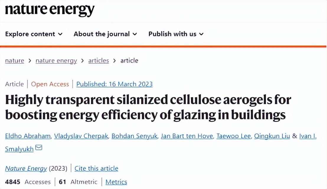 在这里,科罗拉多大学的Ivan I. Smalyukh团队展示了高度透明的硅烷化纤维素气凝胶(SiCellAs)的可扩展制造,其材料特性足以用于玻璃应用。这些高度热绝缘的SiCellA材料,夹在玻璃板之间,可以使窗户具有较高的热流阻力R,如RB = 5 h ft2°F Btu-1(北美常用的英制单位,其中Btu代表英国热量单位)和RS≈0.9 m2 K W-1(国际单位制)。SiCellA可能有助于以传统双层中空玻璃的几何形状系数实现这种高的R隔热性能,并可能实现采光和天窗的玻璃,不仅可能超过窗户的现行标准和目标,甚至可能超过建筑墙体的标准。虽然使用空气或其他气体填充物的中空玻璃受到大窗格之间的对流和多窗格玻璃-空气界面的光线反射的限制,但基于SiCellA的中空玻璃不存在这种内在的限制。这种玻璃可以使建筑围护结构的设计更好地利用外部条件,为居住者提供自然的舒适度。他们展示了SiCellA薄膜如何用作中空玻璃单元的填充物,以及在多层中空玻璃单元设计中取代内部玻璃板,并与现有的热辐射范围和太阳能增益控制的解决方案完全兼容。他们设想SiCellA将为建筑技术所面临的能源管理挑战提供一个整体解决方案,甚至有可能帮助下一代建筑从环境中利用能源,通过增加玻璃的使用,更好地利用太阳能加热和自然采光,前提是SiCellA的生产在经济上可行。相关研究工作以“Highly transparent silanized cellulose aerogels for boosting energy efficiency of glazing in buildings”为题发表在国际顶级期刊《Nature Energy》上。祝贺!