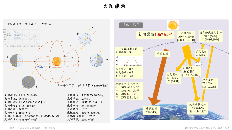 太阳是地球全部能源的最终来源。太阳常数是1367瓦/平米,到达地面以后,大气层吸收了一半,还剩下一半能够到达地面,但到地面这部分已是现在全世界所有能量运用的很多、很多倍。所以用太阳能来解决用电需求是完全可行的。