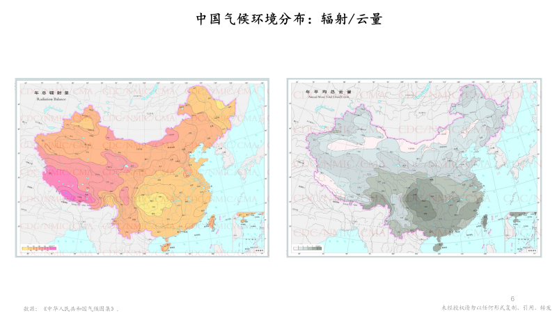 再来看看我国能源的分布,总体来说是西部是太阳辐射比较强的地方,地图中间黄色区域是四川、重庆、贵州,右边这张图是云彩的分布,也可以看出云雨较多,太阳就少了。如何解决太阳能源不足地方用电需求?