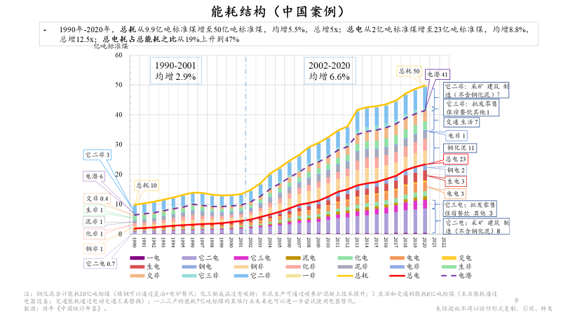 但是,很多非电的能耗,我们下面其实有数字,今天来不及展示了,可以把非电能耗转成电的能耗,这样就可能需要翻倍增加用电及翻倍的电力投资。现在需约50万亿投资,如电气化翻倍就可能需要100万亿, 按20年算,年均5万亿,对经济具有相当大的拉动作用,且是一个非常系统有序的退出并实现双碳问题的解决。