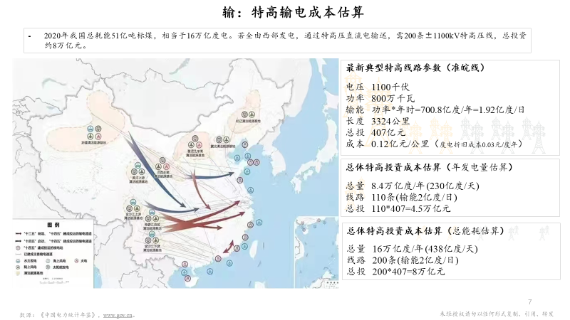 可以将光电场设在西北,因为这个地方辐射最大,然后输电至其它地区。目前我们对输电的初步计算,就是以国家电网已经有的一些实践为基础,比方说一条典型的准皖特高压线,就是从准噶尔东部到皖南,大概3000公里,总投了400亿,这一根线一天能输2亿度电。根据我的计算,现在中国一年是8万亿度电,一天也就是约220亿度,如若220亿度全部都需要输电,大概需要100余条这样的线,而一条线是400亿投资成本,所以这100条线也就是大致4万亿,其实它的总投资也就是约4万亿。