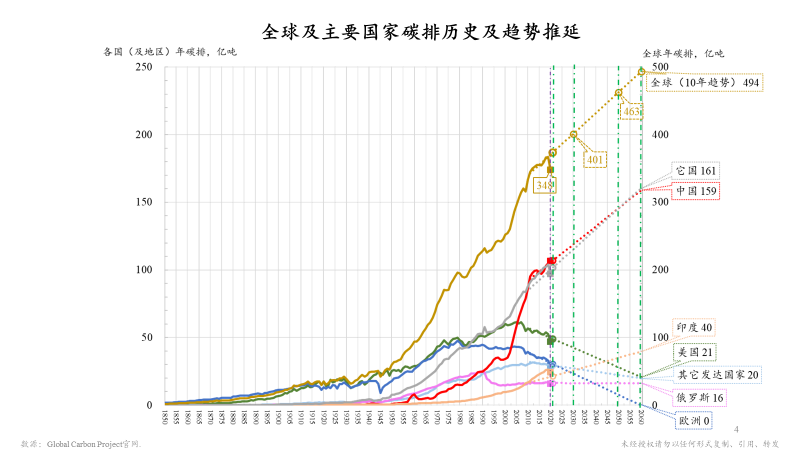 如果我们按照现在看到的全球碳排趋势再继续涨,比方说,到了2030年就变成了401吨,2050预计463亿吨,2060年494亿吨。如不转型,世界排放规模是巨大的。