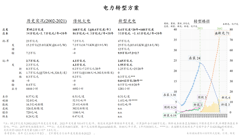 也就是说,只要现在这个政策一定,可能很快就是碳达峰了。随后每年的火电厂都会自然折减,如果每年折旧率5%,20年以后它的初始就基本折旧完了,那就基本碳中和了。因为煤电机组都已经用完预期寿命了,已经自然折旧了。所以,我们可以20年内非常有序地转移。这个转移的过程就是新的投资, 20年间每年会有数万亿的投资。