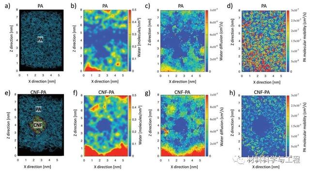 图3. a)PA结构模型,(b)水密度,(c)水扩散系数,以及(d)芳香族普通聚酰胺(PA)膜的聚合物迁移率图,(e)PA-CNF结构模型,(f)水密度,(g)水扩散系数和(h)聚合物迁移率(仅PA部分)图