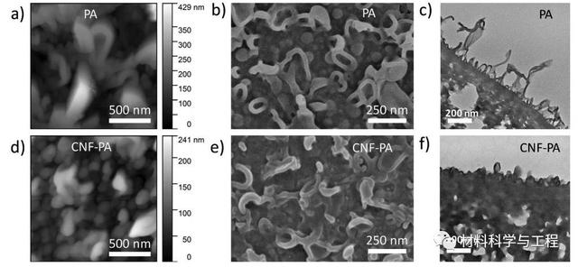 图1. 合成膜的形态。(a)AFM,普通PA膜的(b)SEM和(c)TEM断面图。(d)CNF-PA膜的AFM图,(e)SEM和(f)断面TEM图像