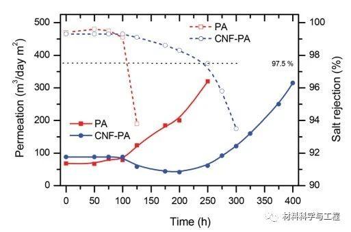 图5对于CNF-PA膜和实验室制得的普通PA膜,在20 ppm的连续氯暴露下,水的渗透率(左实线)和脱盐率(右虚线)的变化