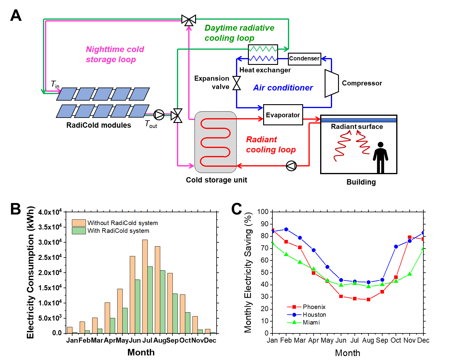 文章提出了此系统与建筑结合的全天24小时连续运行技术路线,以此来最大化辐射制冷系统的效能。对一个5000 m2的商业建筑进行了制冷能耗模拟计算,结果显示针对纬度较低地区的3个不同城市(Phoenix, Houston, Miami),该系统在冬季(11月-2月)可以降低64-82%的制冷能耗,在夏季(5月-8月)可以降低32-45%的制冷能耗(图5C)。