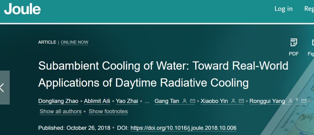 Dongliang Zhao, Gang Tan, Xiaobo Yin, RongguiYang et al. Subambient Cooling of Water: Toward Real-World Applications ofDaytime Radiative Cooling. Joule 2018.