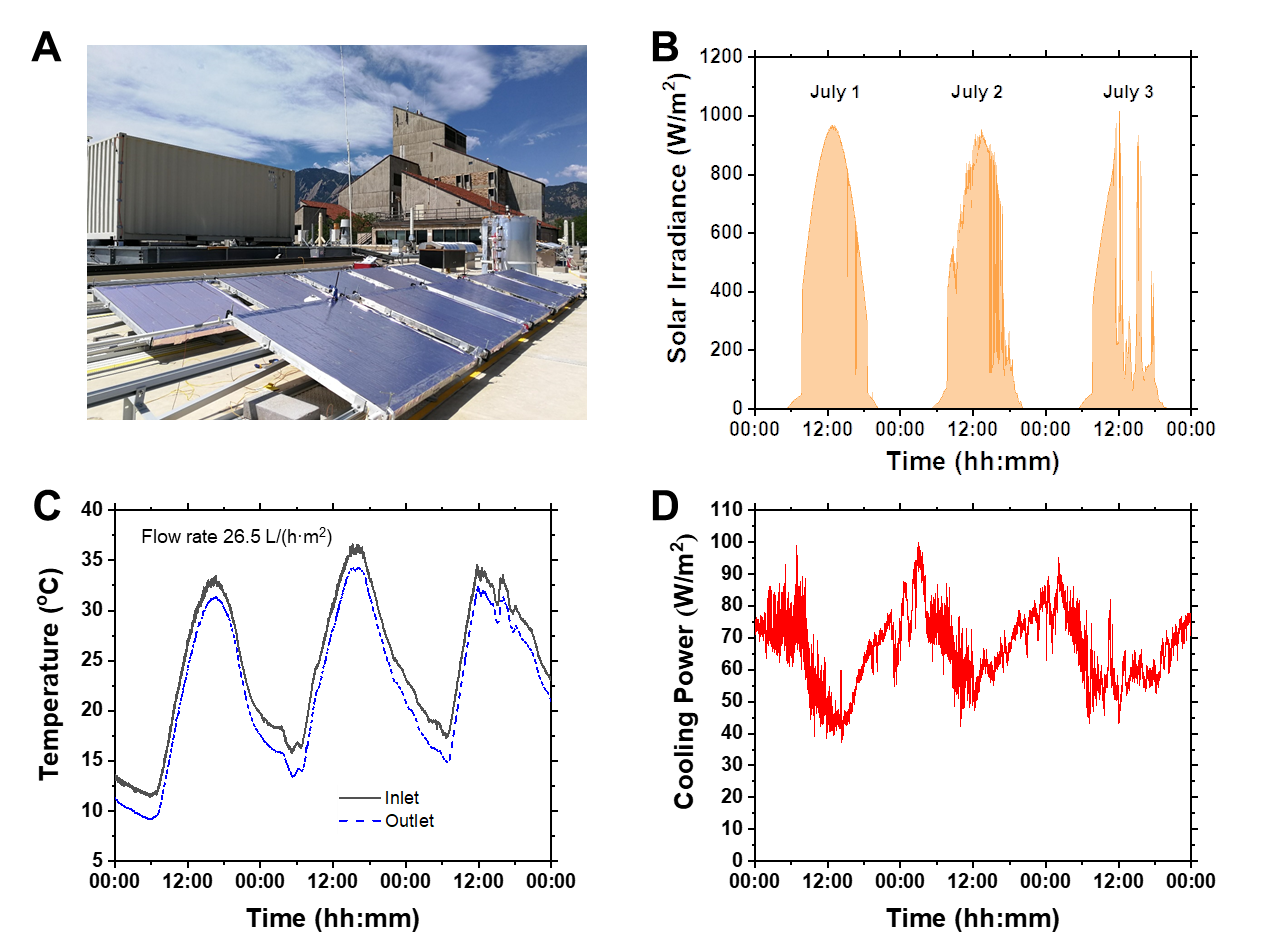 通过对一系列环境因素,例如风速、降水量以及云层对辐射制冷效果的影响,该团队公开发表了第一个能在白天太阳直射下给水降温的千瓦级辐射制冷系统(图4A),此系统使用连接了10个模块,总辐射表面积为13.5 m2。随后在天气情况大部晴好的条件下(图4B),该团队对系统进行了3天连续测试(图4C)。在3天的连续测试中,系统获得的夜间最大净制冷量为1296 W,正午(12点至2点)平均净制冷量为607 W。系统单位面积净制冷量在40-100 W/m2之间(图4D)。