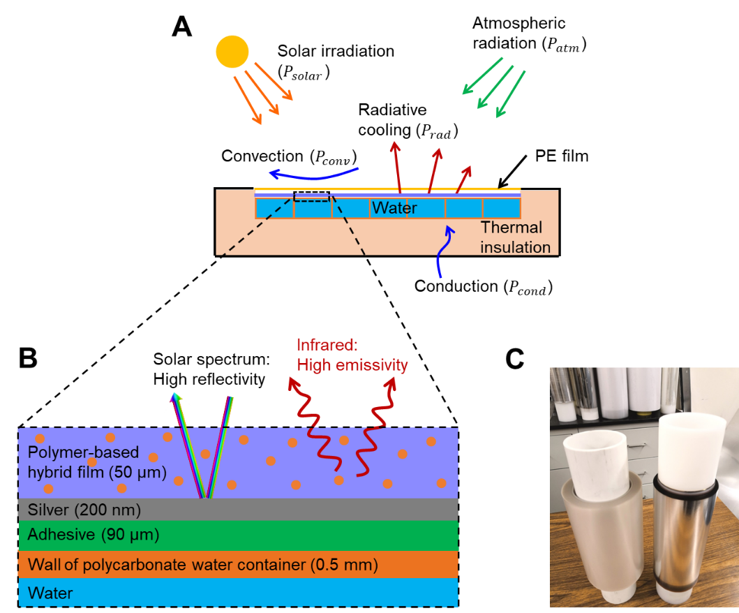 图2A展示了以水为工作介质的辐射制冷集冷模块的截面图,其由辐射制冷超材料、polycarbonate水板、polyethylene薄膜,以及保温材料等组成。该团队使用对比试验的方式为我们展示了辐射制冷超材料和模块的制冷性能。