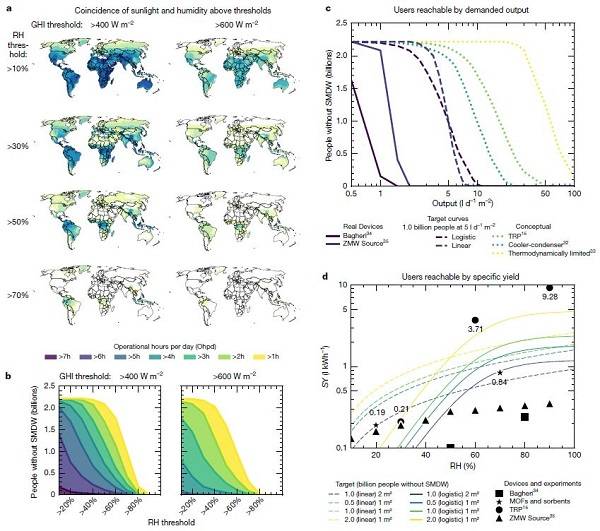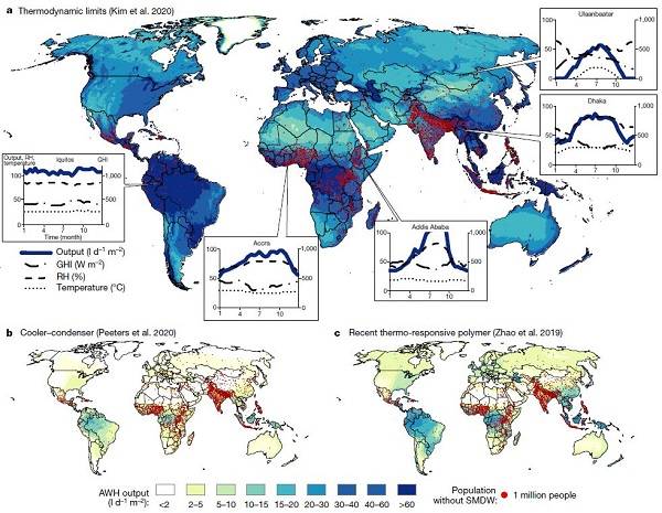 在建立模型的过程中,研究人员承认,能够从空气中吸取水分的太阳能设备只有在某些条件下才能正常工作,这些条件包括:湿度通常达到30%,阳光充足,足够温暖。为了考虑生活在这些地区的人们的情况,研究人员从全球各地的站点提取了平均天气数据,并将它们与面临水挑战的人口绘制成地图。在这样做的过程中,他们发现超过10亿人可以从这种设备中受益,这种设备平均每天可以生产5升饮用水。他们最后声称,当前的技术趋势表明,他们在模型中设想的假想设备可能很快就会成为现实。然而,到那时,使所有人都有能力支付其费用,会使更多人成为该技术的受益者。