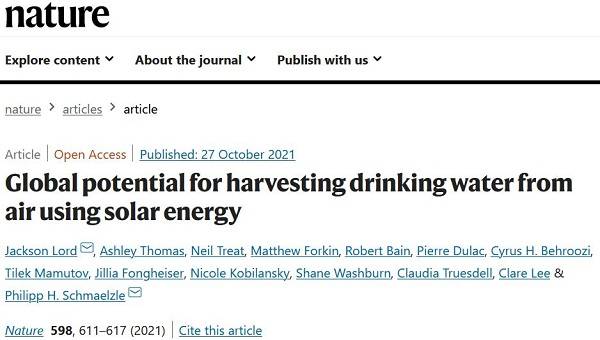文献链接:Global potential for harvesting drinking water from air using solar energy(Nature, 2021, DOI: 10.1038/s41586-021-03900-w)