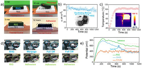 由于高的潜热值(约2450 J g-1),水被认为是一种理想的相变材料,其蒸发过程可被用于过热表面的制冷降温。因此,通过吸湿材料将空气中的湿气进行富集,可有效地用于器件的蒸发制冷。最近,研究人员通过将具有吸湿性的离子液体1-乙基-3-甲基咪唑乙酸盐([EMIM][Ac])分散在亲水性的聚(丙烯酸-co-2-丙烯酰胺-2-甲基丙磺酸)(P(AA-co-AMPSA))网络中,制备得到了一种兼具强吸湿性和粘附性的离子凝胶(RIG),并将其用于热电发电机(TEG)的蒸发制冷以提升其电力输出(图1a)。实验结果表明,相比于商业化的金属散热器(AHS),吸湿后的RIG能够帮助TEG器件实现更加明显且持久的蒸发制冷效果,且其制冷效果可通过RIG在空气中吸湿再生而恢复(图1b-c)。另外,由于[EMIM][Ac]的引入,在多重超分子相互作用的作用下,RIG在吸湿前后都表现出对TEG表面可观的粘附强度。因此,RIG在为TEG蒸发制冷过程中可以保持一个稳定的制冷界面,克服了传统水凝胶在制冷过程因过度水蒸发而产生的界面剥离现象。基于此,该RIG能够为一个装载在一个动态的过热表面(加速度约为63.8 m s-2, 表面温度约为103 ℃)的TEG进行有效的蒸发制冷,以显著提升其工作效率(图2)。