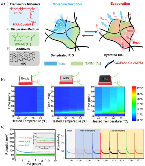 图1 a)吸湿凝胶RIG的构建及其蒸发制冷的工作机制;b)不同制冷模式下TEG热端冷端的温度差;c) RIG用于TEG冷端的蒸发制冷,以提升其工作效率
